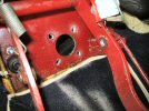 While I've got the drill out, I use a sharp thingy (I don't know what it is, it's sharp and it's got a handle - oh yes, a bradawl, that's it!) pushed up through the floor, to show me where I have to make holes in the carpet - 4 each side for the seat bolts, and 2 each side for a pair of push fasteners that seem to hold the front edge of the rear section down. Then I drill through the carpet, making sure I don't enlarge the holes in the body tub. The two front ones (for the clips) are right above the outrigger crossmembers, so I also have to be carful not to drill holes in the top of those!