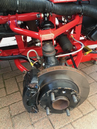 Then I remove the dampers and springs by undoing the top and bottom bolts on each side. I wind the adjusters down as far as they go, and slide out the top cups and remove the springs. Ready for reassembly!.