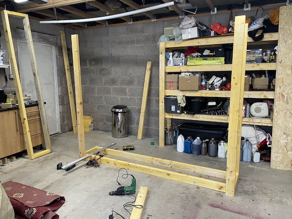 And here it is! I suspect that it is somewhat over-engineered, and could probably support a whole car, rather than random bits of vehicles long since departed, but I'm happy. once I get in manoeuvred into position against the wall.