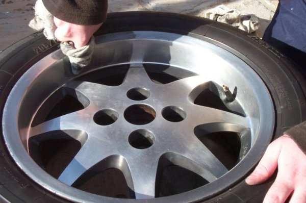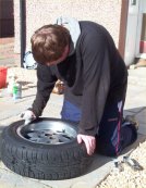 Following the success of cleaning and polishing one wheel, I decide to do the other three. This is the state of the first wheel I take off. The photo doesn't really do justice to the dull finish, and the amount of chipping and scratching.
