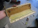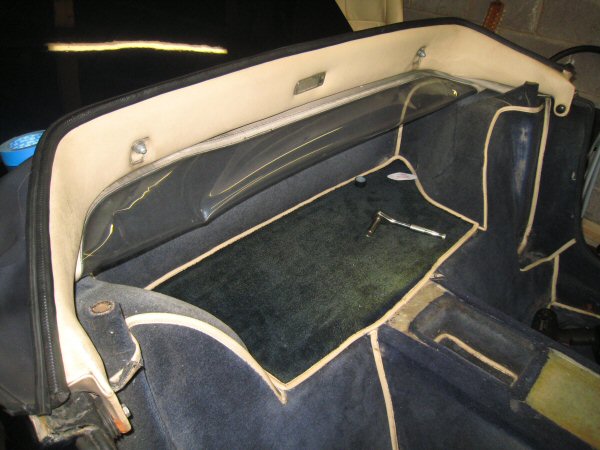 Now I've reached a position where I can't start the brakes till I have a servo, I don't get the new carpets delivered for a couple of weeks, so I can't do those, so I'm a bit stuck. I think I'll re-trim the inside of the roof panels, but first I need to get the trim off round the back edge of the hood, because the carpets are glued up behind it. It's held on with 5 long cross-headed set screws that go into the boot. I need to figure out how to prevent the screws turning while I loosen the bolts, without cutting holes in the hood.
