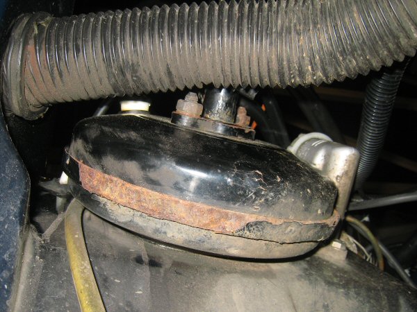 I'm getting knackered now. I'll have a wee sit down on a box and remove the front offside wheel arch. The screws are rusty, I meant to buy stainless ones but didn't get around to it. Once the wheelarch is off, I have a look at the underside of the servo - it looks like surface rust in this photo, but it's flaking off in chunks.
