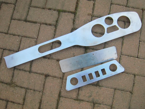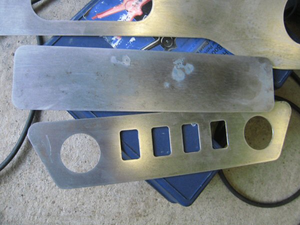 After half an hour of sanding, and then another 10 minutes with a Dremel to clean off the edges of the panels and the inside edges of the instrument and switch holes, they look like this. Maybe a brushed metal finish wouldn't look so bad eh? I notice a number of neighbours looking out to see what all the racket was. Maybe I'm not as considerate as I thought...