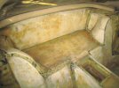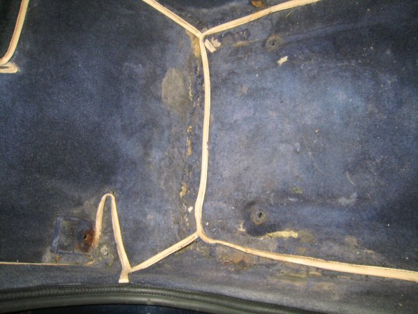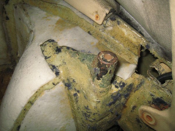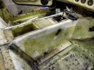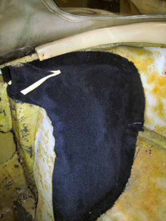 Then it's on to the vertical panels behind the seats. I lever the edge away, in front of the top seat belt mount, and the carpets come off more or less in one piece, except for the bottom 4 inches or so which have been soaked and are falling to bits. These can't be scraped off, because there is a foam backing, so the old carpet has to be picked off in tiny bits.