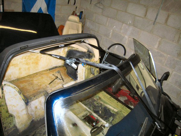First, I need to find a way to hold the rear bit of the hood up - it's in the way when it's down, and it will be impossible to glue the new carpet in, and hold the roof up at the same time. So I get a couple of cable ties and make two loops, then loop a ratchet strap through the cable ties, and under the windscreen wiper. If I loop the cable ties round the front nuts for the roof struts, and adjust the length of the strap, I can hold the roof up out of the way.