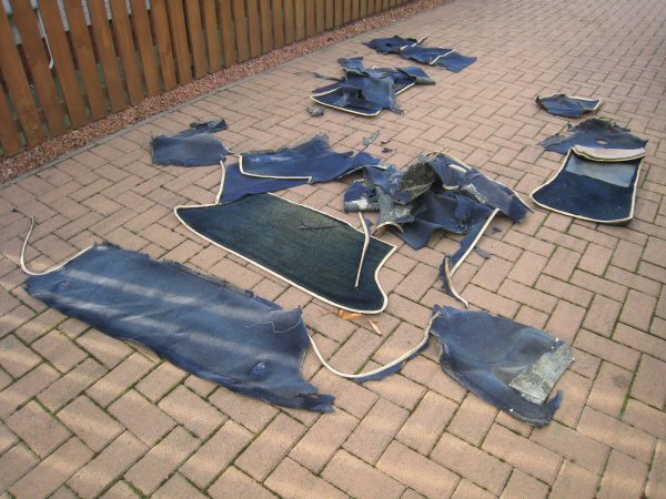 I need to take them out in the right order, because they are tucked under each other. So first it's the footmats, which come out easy because they were never glued in. Then the floor carpets under the seats - now these are rotten, having been soaked through several times - and they were rotten when I got the car, before I spent months tracking down various tiny leaks. So the floor carpets have to be scraped off in tiny bits with an old blunt screwdriver, and it takes bloody ages.