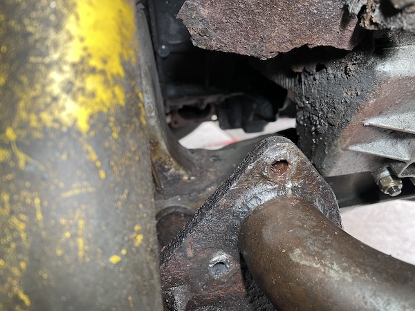 and this... this is the left side of the exhaust, with the cylinder head top left, and the heat exchanger on the right. Top centre, you can see one of the studs holding the exchanger to the engine - effectively the exhaust manifold bolt - and you can see how rusty that is. You don't want to be touching them unless you have to!