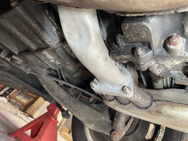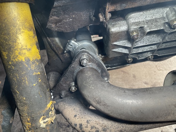 I don't have any photos of the reassembly process it occupied both hands, one knee and the top of my head. But basically, it involves fitting the sealing ring and then the seal to the end of the new new pipe, and then threading that up from underneath, and sliding on the new short flange with a smear of exhaust sealer. Fit the right-hand bolt loosely, then the left ones and tighten them up.