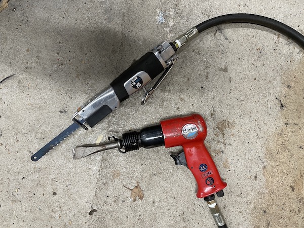 These are a fantastic bit of kit for cutting through things in tight spaces. Mine takes standard hacksaw blades, cut in half. They save a lot of effort, they reach spaces that ordinary saws can't, and they make a nice noise, especially when the compressor kicks in.