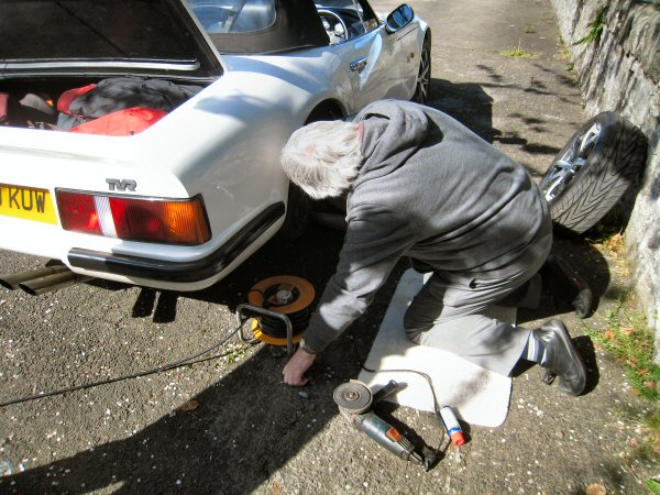 Here's a picture of Dave helping Jim to angle grind the end off the bolt. You'll notice that Jim isn't in this picture, he's in the corner of the garage, covered in elbow marks.