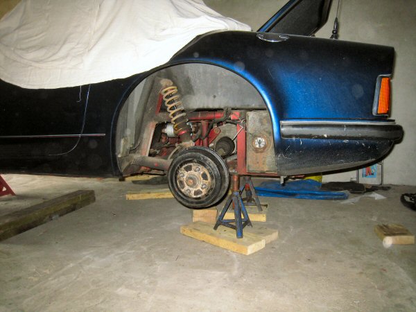 Anyway, car up, supported on axle stands (the first test for stability having shown that it wasn't very secure at all). I remove the wheels and stack them in the corner. Before I forget (this is a note to me so you can ignore this bit if you like) the tyres are stacked, bottom up, in this order: LH front, LH rear, RH front, RH rear.