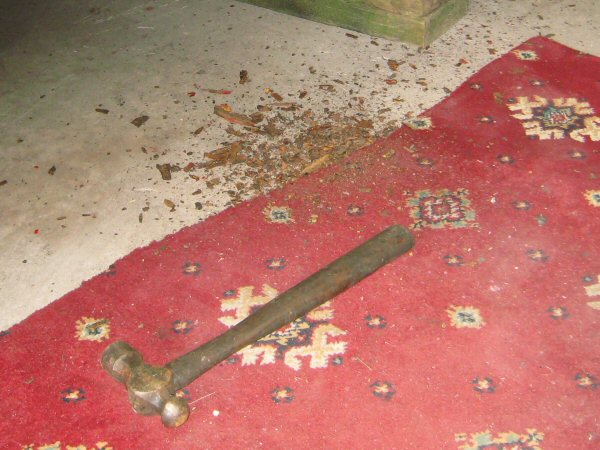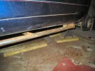 Next step is to remove the 4 bolts across the front of the footwells. These are the ones you can't reach from inside and outside at the same time. I set up a block of wood on the floor to hold the combi spanner at the right andle. Then I wedge in another bit of wood to prevent it turning. Then I put a hammer on top of the bolt head, to weigh the spanner down over the hex, and then another bit of wood on top of the hammer.