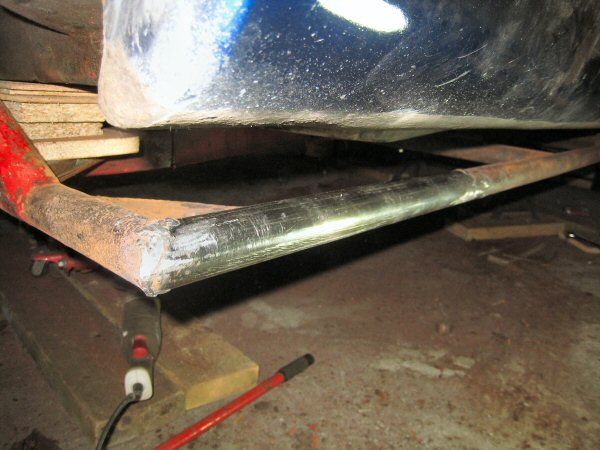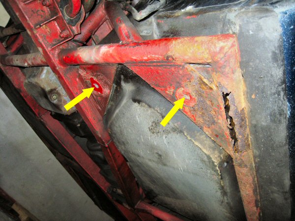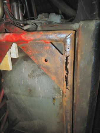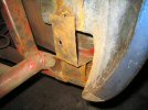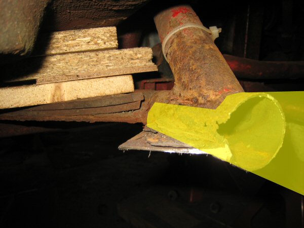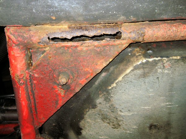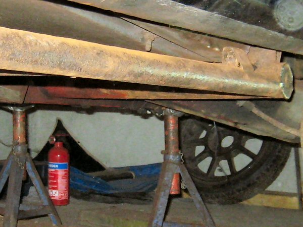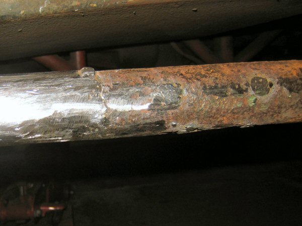 There isn't a lot left of the chassis tube alongside the body plate. The first photo shows the bottom, looking up. The second one is taken from the wheel arch, along between the tube and the body. There is virtually nothing left of the top of the tube. The body plate is held in place mainly by the body.