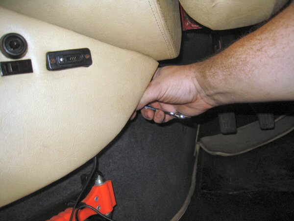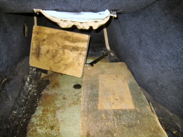 Then I lift what's left of the carpet behind the seats, and wedge a ring spanner on to the top of each bolt that goes down beside the transmission tunnel. The nuts on the bottom come off much more easily because they are out of the tyre spray crud.