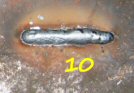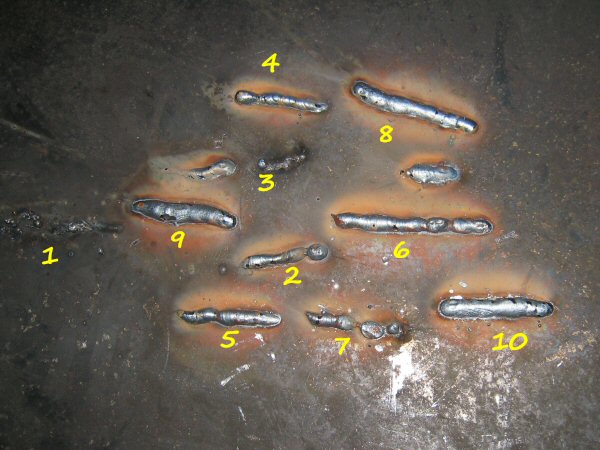 Between adjusting the wire speed and the settings, and looking on the reverse to make sure it's welding right through, I reach weld 6, and I'm getting fairly happy. So far I've been "pulling" the torch away from the weld (welding left-to-right) so I decide to try "pushing" right-to-left. First attempt is a disaster because the wire jammed in the gun - it got a kink in it coming off the drum and stuck in the feed roller. That cleared, I set off again - and pushing seems to be a lot easier than pulling, for me at least - you can see better what you're doing, for a start.
