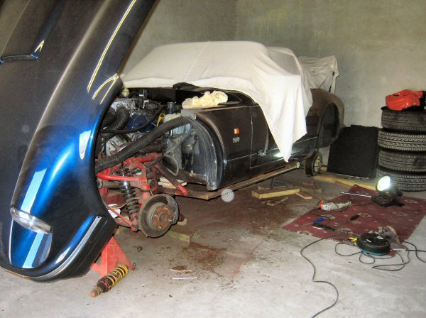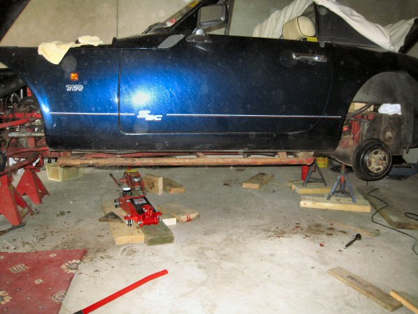 So that leaves the body held on only by the 4 bolts in the footwells, plus 2 in the boot (they should be ok, I replaced them with stainless a few years ago). I also still have to disconnect the steering column, the petrol filler, an earthing strap beside the gearbos, and some electrical wiring, and we're ready to lift. I think. We'll find out soon enough, eh?