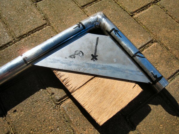 Second reason is that I will be cutting the cross-leg shorter, so that it fits on the outside of the join where the diagonal cross-brace joins the tube from the top. Both the cross-brace and the rest of the chassis tube are ok so I am not replacing them unless I have to. The mark on the tube half-way between the ends of the plate, shows where that brace joins on.