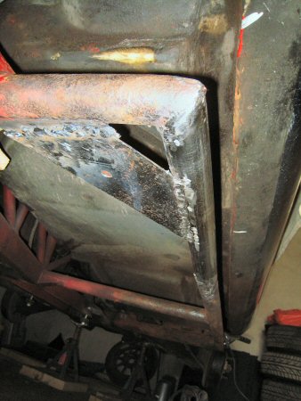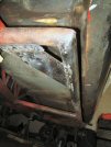 Then I put the whole assembly back in place, clamp up the body plate, and tack weld the front corner. Check all the alignment again, then seam weld the front joint and fill in the outside plug welds.