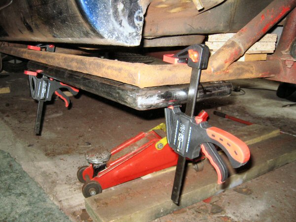 So then it's on to the right hand side. First I clamp the new pipes into place so that I can check the approximate fit, and it looks good! You can see in these photos how the front tube extends past that cross-brace, so that I have options on how to join that all up, depending how rotten the back of that front tube is.