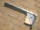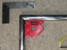 Then I mark up my cut line on the sill tube (allowing 3mm for "adjustment" later - it's easier to file 3mm off, than it is to add it on if it's too short!) Then I cut through the front tube with an angle grinder, and then at an angle through the body mounting plate. Unfortunately just as I finish, the cutting disk catches in the tube and shatters - never use an angle grinder without the disk guard and without proper gloves and eye protection! I cut through the side tubes with an ordinary hacksaw - nice straight controllable cut!