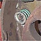 15. Now pick up the flat brake adjustment arm, and the short fat spring that holds it on. Hook the spring through the hole in the shoe, put some copper grease on the mating surfaces of the arm and the shoe, hook the spring through the arm and twist the arm into position by hand.