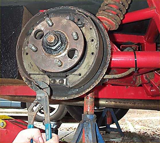 4. Pull the shoes off one at a time - again there is a special tool for this but I use large pliers. Just be careful that you lever on the metal shoe and NOT the brake friction material.