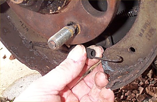 3. remove the shoe retaining springs. There is a special tool you can buy to do this, but I have never bothered - a pair of mole grips applied lightly to the circular retainer (careful not to crush it!) - press back, hold the pin from behind with a finger, half turn (pin or spring) and there you go!