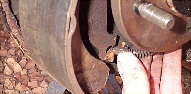 18. Looking down from above, it should look like this. Note the adjustment pawl pushed right back. If you don't do this, you'll never get the brake drum back on!