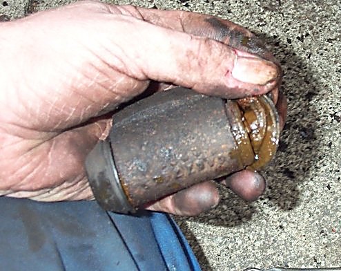 11. Here's the wheel cylinder removed. The bit under the rubber seal should be dry. The brown stuff is a mixture of brake fluid leaking out, and rusty water leaking in. This is a bad sign. You can spend several hours cleaning this up, and buying and fitting new seals, to get it working properly again.