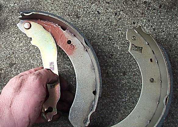 13. Pick up the rear brake shoe. The handbrake lever should be on the back (nearest the backplate). Start with a little bit of copper grease on the handbrake actuating arm. Make sure it's nice and free.