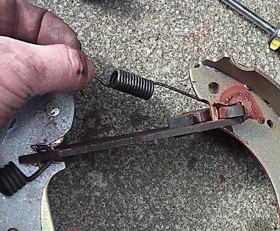 17. Now take the second-biggest spring, and hook it through the shoe from the back, then hook it through the hole in the arm as shown here. Then take the little thin spring, hook the round end over the button on the adjuster, and the other end through the other hole in the arm.. grease the adjustment pawl and mating surfaces on the other end of the arm.