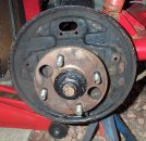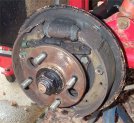 1. With the wheel off, the brake drum is held on only by friction. It should come off easily. If it's stuck on (like mine was) then careful hammering (to jolt it free) combined with careful levering between the drum and backplate did it. I also had to work around the drum levering each bit off a tiny bit at a time.