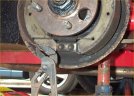 20. Locate the top of the shoes against the wheel cylinder pistons. Again, a dab of grease on the mating surfaces. Then hook the front shoe first, onto the bottom pivot point (grease again!) and then the rear shoe with the pliers again.