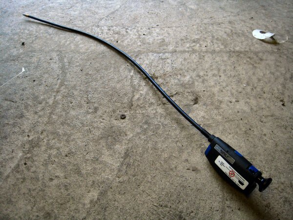 Then I decide to put this wee gadget to use. It's an endoscope, ideal for the tricky bits of chassis inspection. I'm not planning on doing a full inspection today, I just want to see if the gadget works. It has a light in the end, and interchangeable tips - you can put an ickle angled mirror on for to see round corners! It works well, too - I run it along the top of the chassis rails under the sills, and I can see the tops of the tubes - seem to be ok! I can also see the tops of the outriggers (at the front).