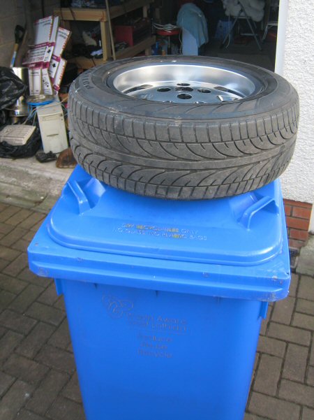 I've reached the stage where kneeling down all day to polish wheels has one unfortunate side effect - I can't get up again. So I've set up my wheel polishing stand (patent pending). The good thing about it is, that nobody will steal it because it looks just like a blue wheely bin. This also has the secondary benefit of lifting the wheel into my range of clear vision...