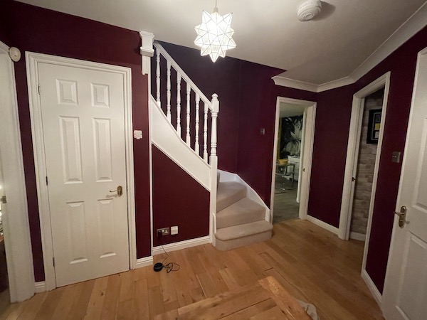 The downstairs part of the hall is finished. The stairs and the top landing need another coat and a bit of edge painting, but it's getting there.