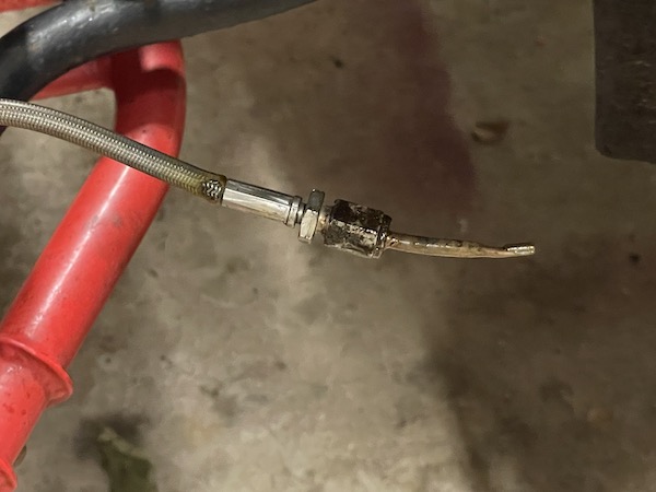 Then I loosen the brake line from the caliper, and unscrew the caliper without twisting the flexi hose. Ypu can't use those pipe clamps on braided lines, so I already have wee bits of brake pipe with a female connector that I can tighten onto the end to stop the fluid leaking out.