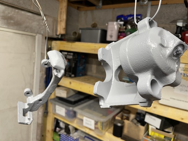 First job today is to finish sandblasting (or beadblasting) the "spare" caliper for the offside, ready for painting. I also clean up the mounting bracket. Then I give them a clean out with brake cleaner and leave to dry while I tidy up a bit. Then I mask off the caliper bore and the two holes for the inlet and bleed nipple, and give them a spray of paint.
