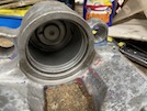 Here's the caliper after I have cleaned all of the old brake fluid out of it - the bore's ok, no scoring, although there is a matching rusty lip where the seal goes. Diagnosis - if that lips cleans up ok, the caliper itself is probably salvageble.