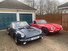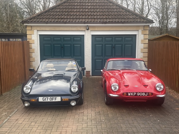 Today I am going to start cleaning the S. First I have to move the cars in the garage so that I can get the S on the left side - where it is, it's right up beside the garage wall. That maximises working space around the car that's parked on the left, but it means that you can't get in to clean the far side. So - both cars out, and I decide this is an opportunity for a photo of both TVRs together - I don't think I have done that yet!