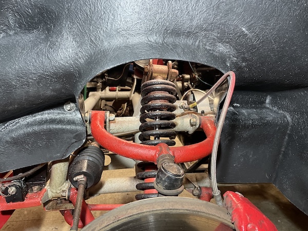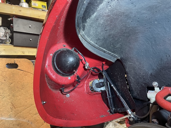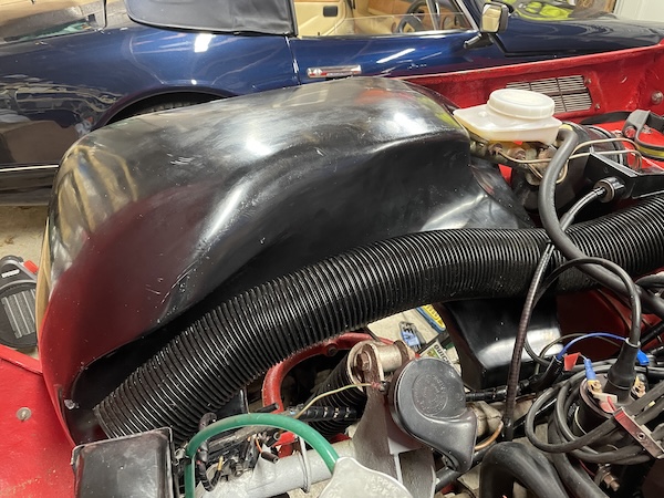 Here's the arch all fitted, with the heater duct in place. You can see how the brake master cylinder fits into that recess in the arch moulding. I still need to reconnect the fan wiring, and then clean all that fibreglass powder off both arches.