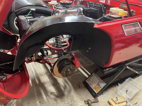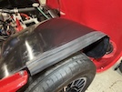 Fitting the new wing is tricker than the other side, because you have to guide it past the brake master cylinder. It fits by putting it upwards into the space, leaning back towards the chassis, and then tilting it outwards into place. Again, I have to cut a corner away for the steering rack, and mark where the chassis u-clamp has to go.