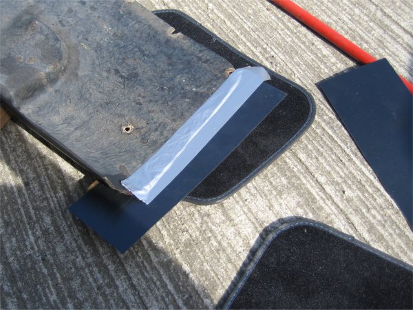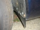 Along to the garage first thing, to fit the mudflap thingys. First cut the A4 plastic in half, lengthways, then remove the bottom wheelarch screw on each side, and slip the plastic up behind, between the wheelarch and the body. A little bit of gaffa tape to hold it in place till I adjust both sides, then remove one arch completely, and drill a 3mm hole and insert a pop rivet with large washers each side to spread the grip. Then another 3 rivets, remove the gaffa tape and refit to the car, then do the other side and hey presto!