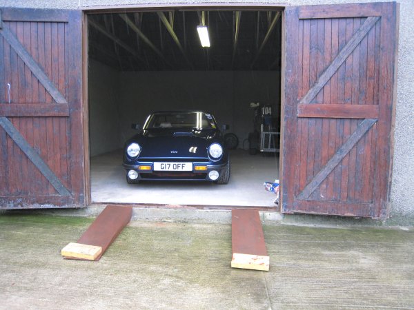 This photo shows the slight slope of the yard compared to the garage floor, and also the angle that I have to negotiate to get the car into the back left hand corner. The two wood blocks on the ramps, by the way, are there for a reason - the front wheels go over them just as the lowest part of the exhaust (the clamps under the sump) cross the threshold of the doorway, giving just that extra 1/2 inch of clearance that prevents the clamps taking chunks out of the wood sill.