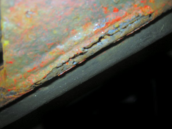 So... went out today just to have a look... everything seems ok, surface corrosion and paint chips only... then I get to the front of the nearside outrigger, just behind the front wheel, and alonside where the body plate bolts on... and there's a 4 inch crack in the paint. "Oh bother" thinks I, before deciding to give it a little poke with a screwdriver, just to remove the loose paint... and the screwdriver disappears. A few taps with a hammer and I've opened up a 4 inch gash along the bottom of the outrigger beside that mounting plate.