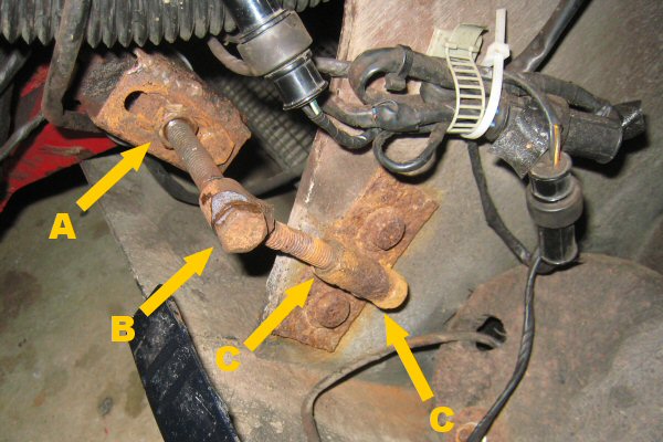 This photo shows the hinge assembly. I notice that the bit of the hinge that's fixed to the bonnet (not the chassis) is bent between the pivot bolt (A) and the adjustable fixing nuts (C), so the first job is to straighten that up. To give better access, I jack up the car and take the offside wheel off, then slacken the locknut (A) into the chassis, and remove the two adjustable nuts (C) on the bonnet part. Then with the bonnet down and supported in position with the wheel on its side, and some bits of wood on top, I remove the main pivot bolt, and take the adjuster out of the bonnet bit.