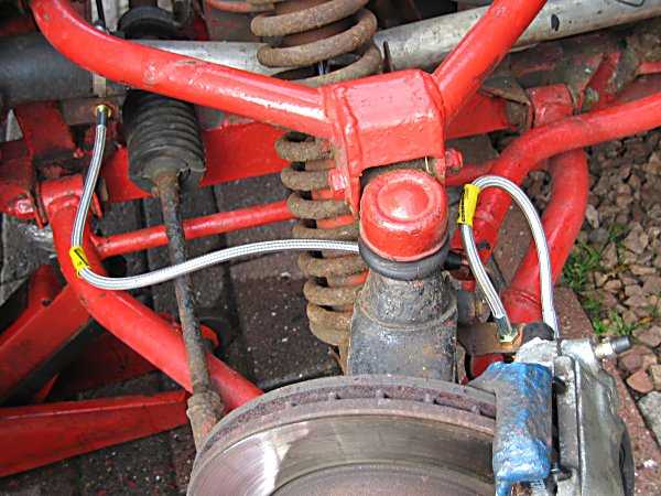 I'll install a short length of metal pipe, with the correct ends on, in place of the short flexi-hose on each side. The longer hose accomodates all the suspension movement, the short hose is only to allow the caliper to be lifted off for brake pad replacement.