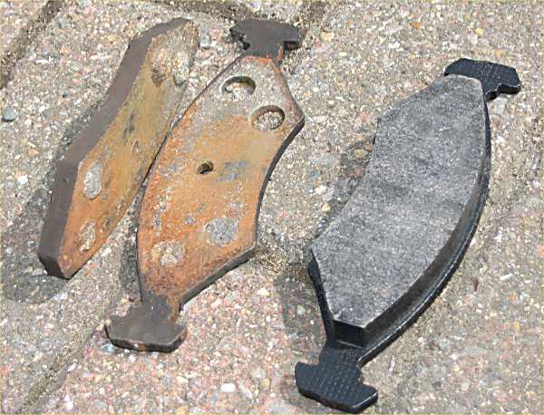 For some reason (don't know why, I didn't have to do it) I decide to take the caliper off so that I can see inside it to check that dodgy hose fitting. When the caliper comes off the brake pad falls in half. This is not good news, you unnerstan? Better than having it come off when I am trying to stop though - that is distinctly a terminal bad news situation - and the indications are that this was probably imminent!