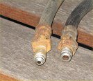 Then I start to the nearside front. The front has two rubber hoses, one from the body out to the hub (to take up suspension and steering travel) and then a short bit of metal pipe before another hose into the caliper (so that you can take the caliper off to change pads, and also to allow the caliper to slide, because that's how it works!