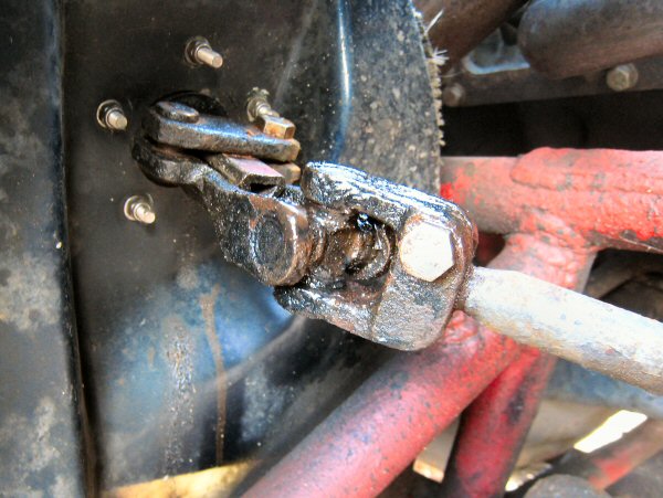 A couple of jobs to finish today. First the steering universal joint. First jack the car up and take off the offside wheel and the inner wheel arch. Remove the pinch bolt that holds the joint onto the splines on the lower steering link, then the bolt that holds the joint onto the bottom of the steering column, I'd marked mine with paint before, because it's important that you get all the bits back in the same alignment (otherwise your steering wheel is out of line when you're going straight).